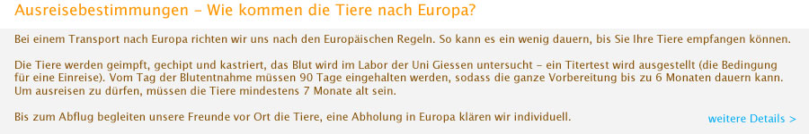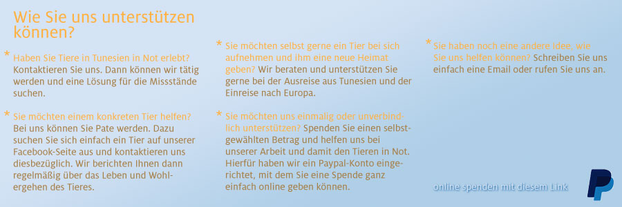 Durch Ihre Clicks auf PetSite.com haben wir das Ziel von 300€ erreicht! Wir und die tunesischen Tiere bedanken uns aufs herzlichste! Schauen Sie in unsere Projekte - da hat sich einiges getan. Mit den Geldern unterstützen wir Kaouther´s Refugium und die Tiere, die von Leila versorgt werden. |